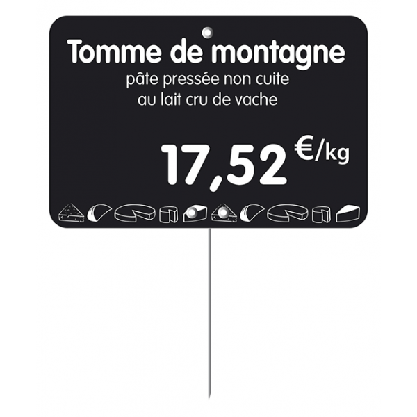 / Etiquette : Noire à texte et prix décor Fromage – 7×10 cm (pique inox)