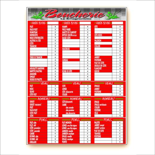 Panneau prix : Tendance rouge boucherie Viande Bovine, Veau, Agneau, Porc – 72×96 cm