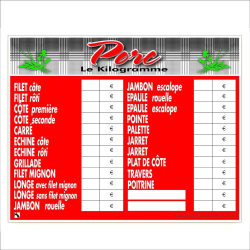 Panneau prix : Tendance rouge boucherie Viande Bovine, Veau, Agneau, Porc – 72×96 cm